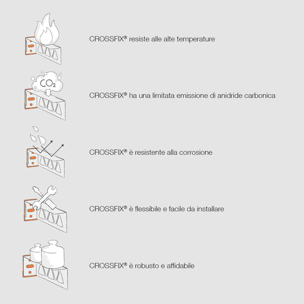 CROSSFIX® il nuovo sistema di sottostruttura universale, nasce per rivoluzionare il mercato delle facciate ventilate e soddisfare le crescenti esigenze di produttori, architetti e costruttori che conferiscono grande attenzione all’efficienza energetica, tutela dell'ambiente e semplicità di installazione in conformità dei massimi requisiti di sicurezza.Grazie all’utilizzo dell’acciaio inox, che ha da tempo sostituito l'alluminio, si è soddisfatta la richiesta di ecosostenibilità con un impatto ambientale minimo.
